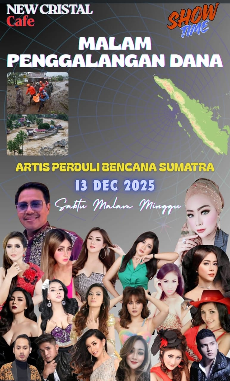 Cristal Cafe bersama para artis menggelar penggalangan dana atau donasi bagi korban bencana banjir bandang dan longsor di Sumatra Barat (Sumbar), Sumatra Utara (Sumut), dan Aceh, adapun kegiatan acara penggalangan donasi ini dengan tema” Malam Solidaritas Penggalangan Dana Untuk Sumatra” dimana kegiatan acara tersebut nanti dilaksanakan pada Sabtu malam Minggu 13 Desember 2025 bertempat di New Cristal Cafe Bar & Life Music, Jalan Raya Bogor No.112 Km 26,5 Ciracas Jakarta Timur, tepatnya di atas Resto Padang Sederhana depan Polsek Pasar Rebo” Ungkap Arsan Manejemen Cristal Cafe.