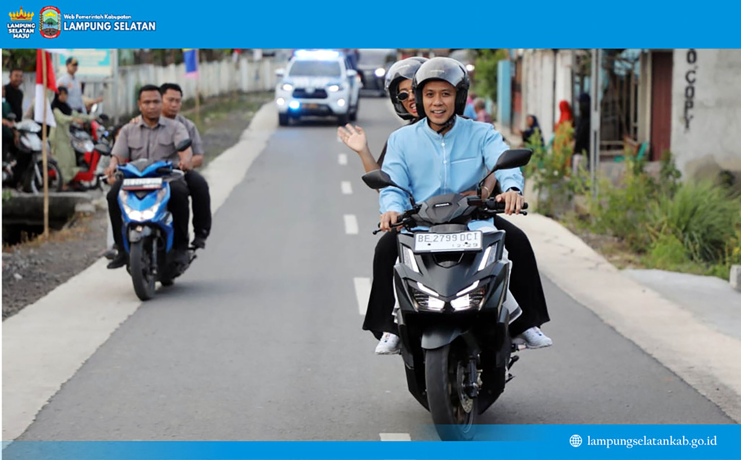 Dengan mengenakan helm dan kain sarung sederhana, Bupati Lampung Selatan, Radityo Egi Pratama, tampak berboncengan sepeda motor bersama sang istri, Zita Anjani, menuju lokasi peresmian ruas jalan Sukamarga-Bulok (R.072) di Desa Bulok, Kecamatan Kalianda, Rabu (22/10/2025).