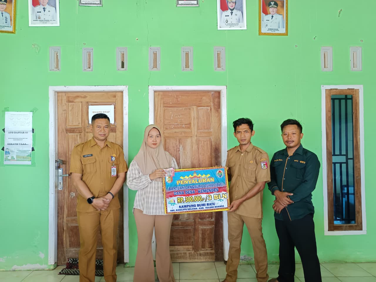 Pemerintah Kampung Bumi Ratu, Kecamatan Rawa Jitu Selatan, Kabupaten Tulang Bawang menyalurkan Bantuan Langsung Tunai Dana Desa (BLT-DD) tahap pertama kepada masyarakat penerima manfaat. Kegiatan tersebut dilaksanakan di Aula Kantor Kampung Bumi Ratu dan dihadiri oleh unsur pemerintah kampung serta pihak kecamatan. (06/04/26)